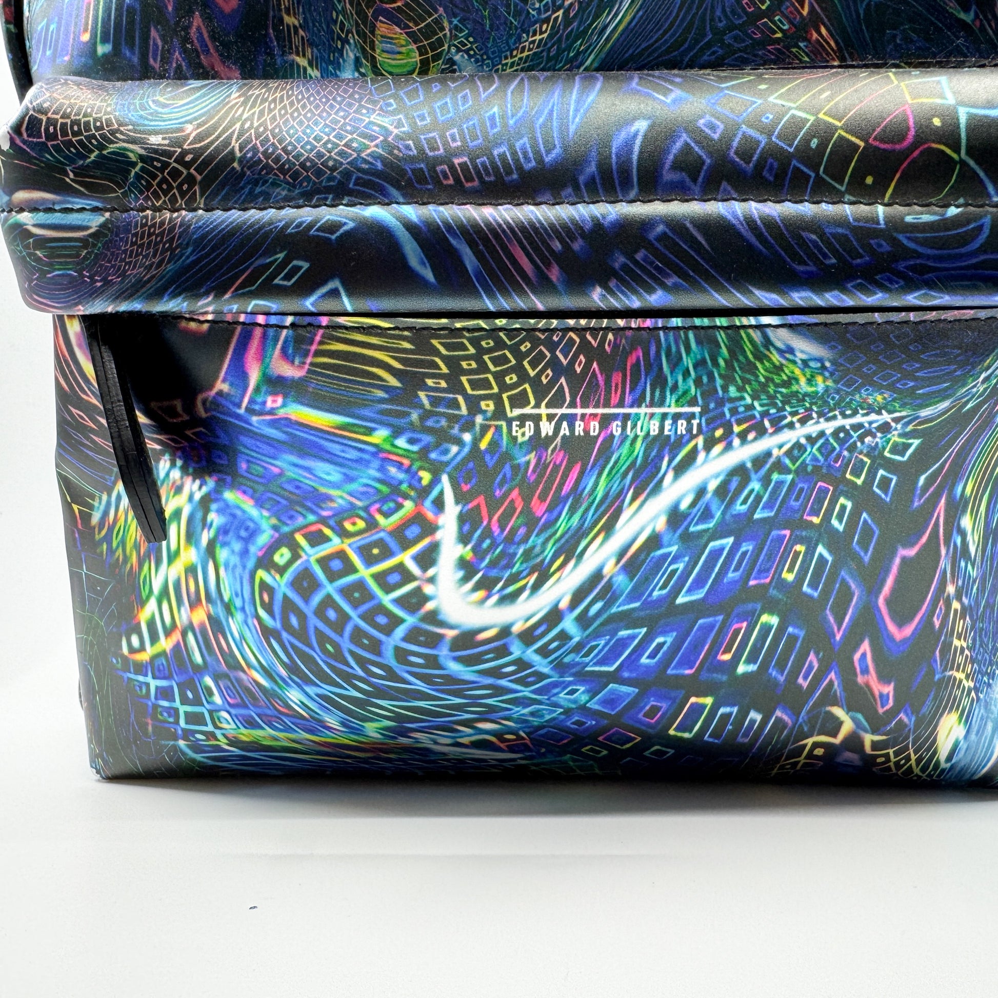 Details: This backpack is the result of a collaboration between Edward Gilbert, an Australian luxury leather maker, and Romance Was Born, a Sydney-based designer brand. It features a psychedelic foil print and digital graphics sourced from Romance Was Born's spring/summer 2014/15 collection. The bag combines quality leather construction with bold, eye-catching patterns—practical and distinctive in equal measure.