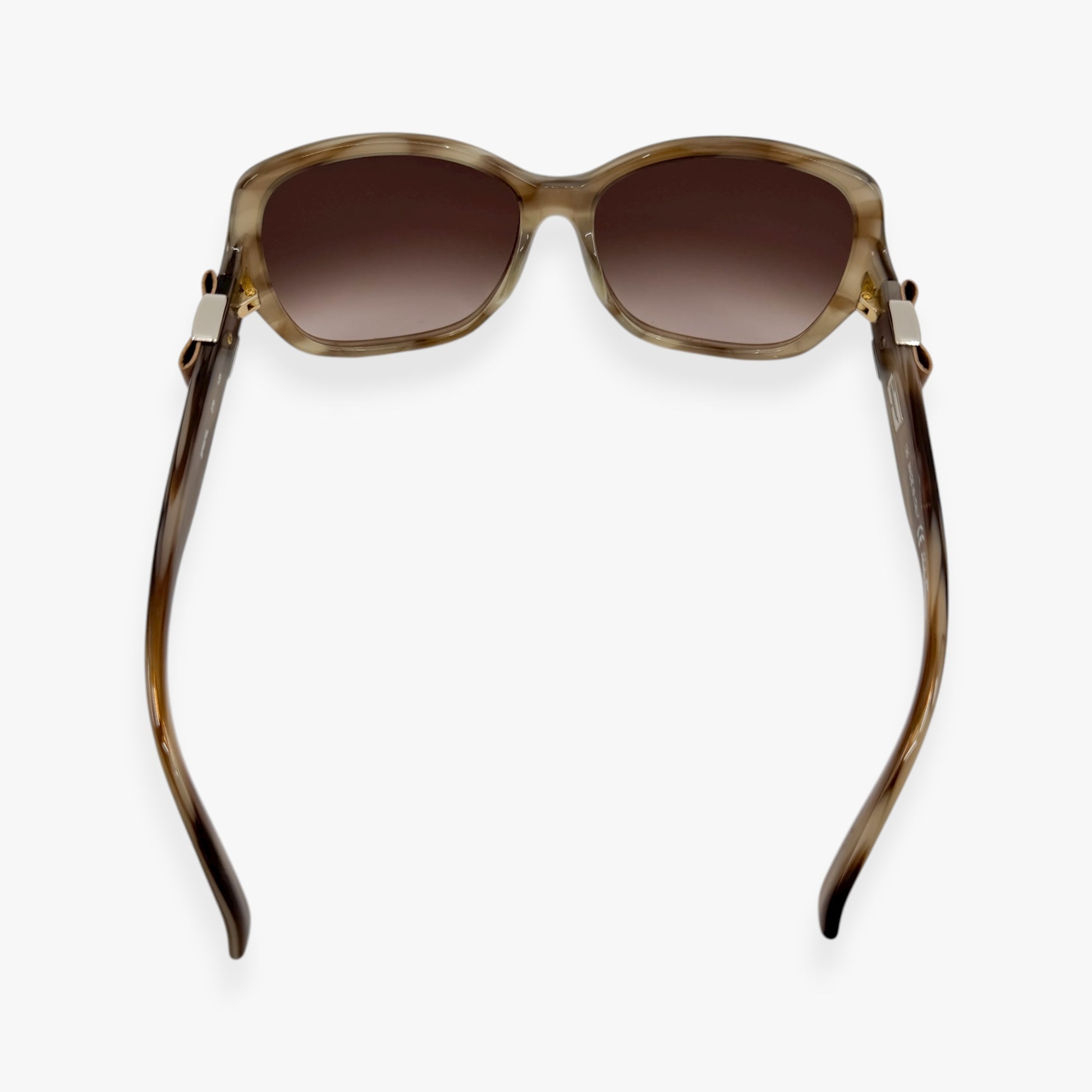 Details: Classic rectangle style with iconic Ferragamo bow on the temples. A neutral light brown mottled acetate frame with brown gradient lenses.