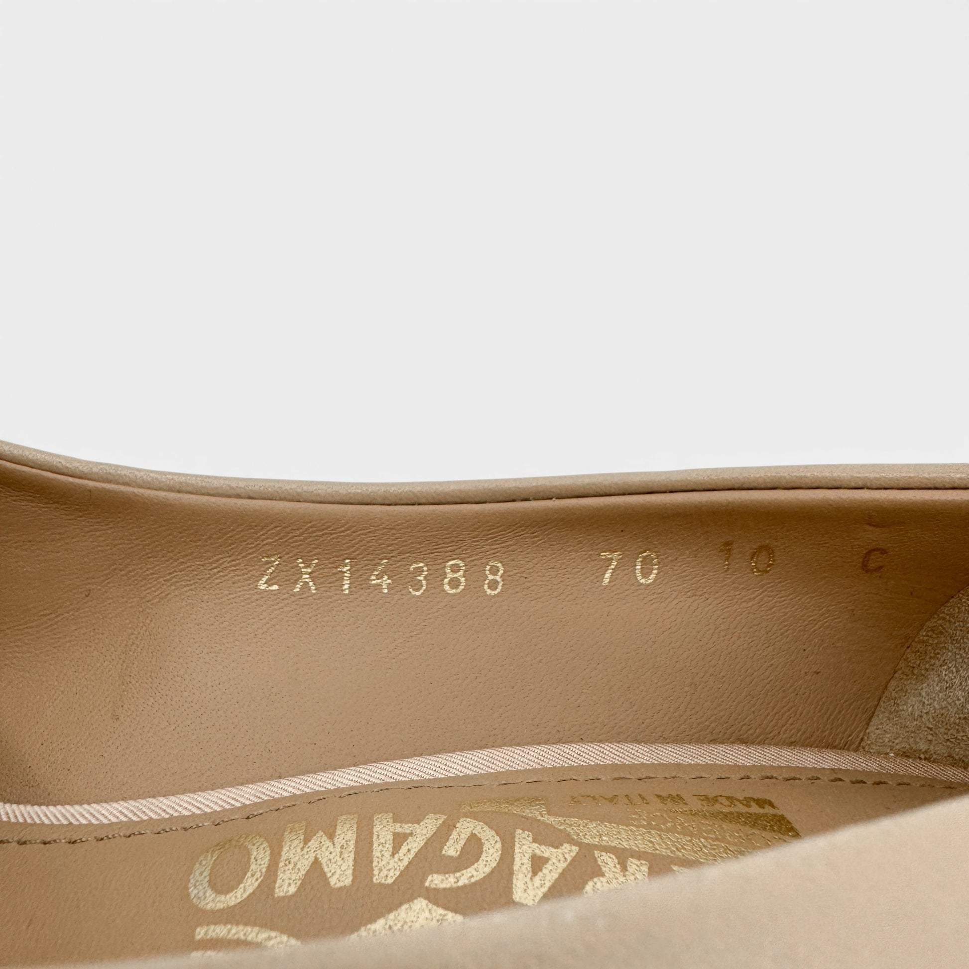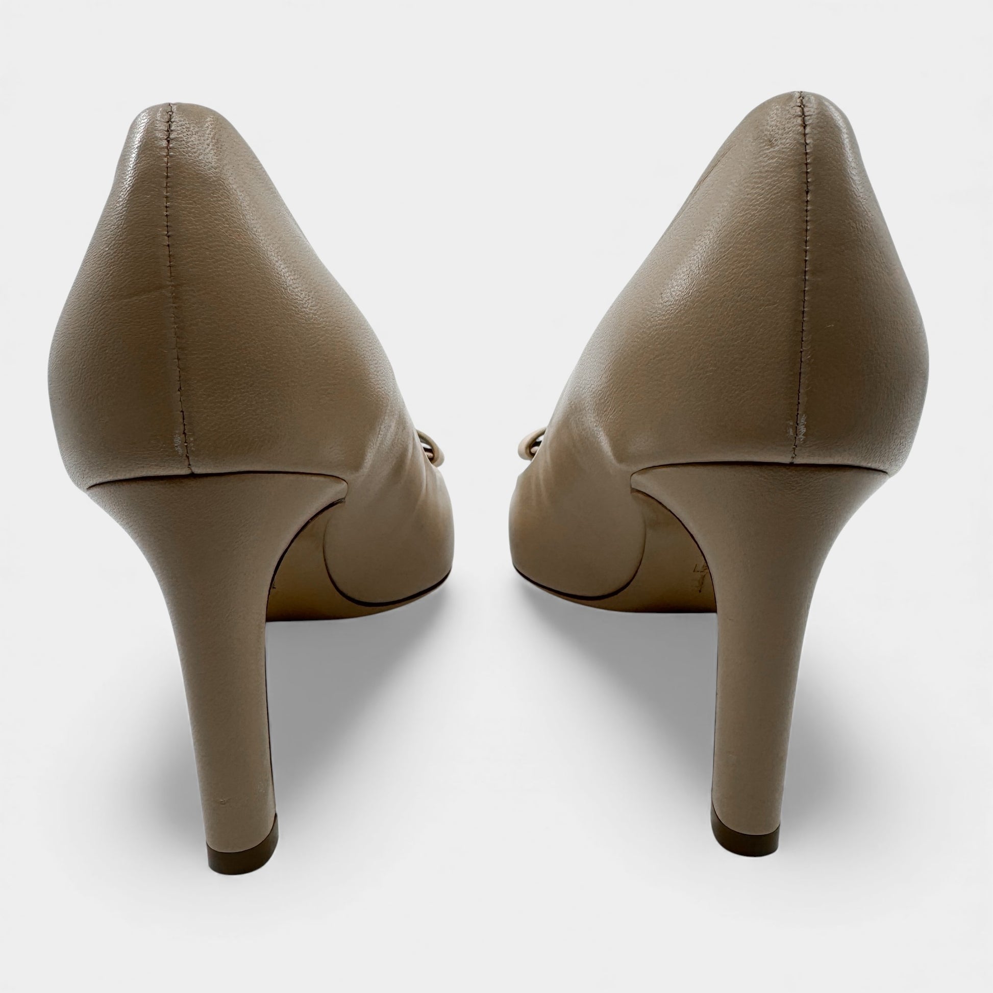 Details: Soft beige leather pumps with a classic Ferragamo grosgrain bow.