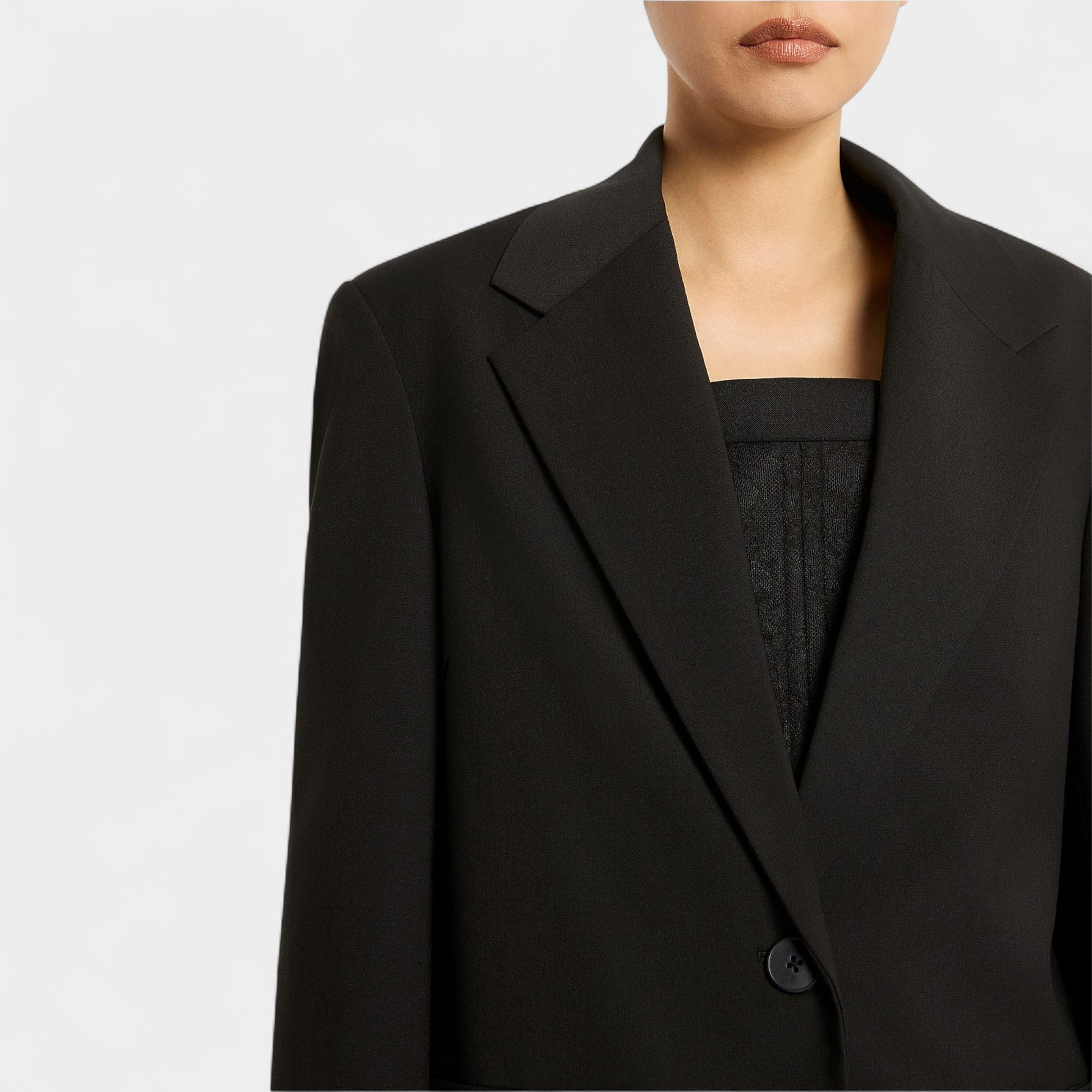 Details: Crafted from a stretch wool blend, this black blazer offers a comfortable, relaxed fit with its oversized, longline silhouette. It fastens neatly at the front with a single black button and is fully lined for added quality. Features include a sharp peak lapel and collar, broad sloped shoulders, tidy buttoned cuffs, and practical welt pockets at the hips, combining style with functionality.