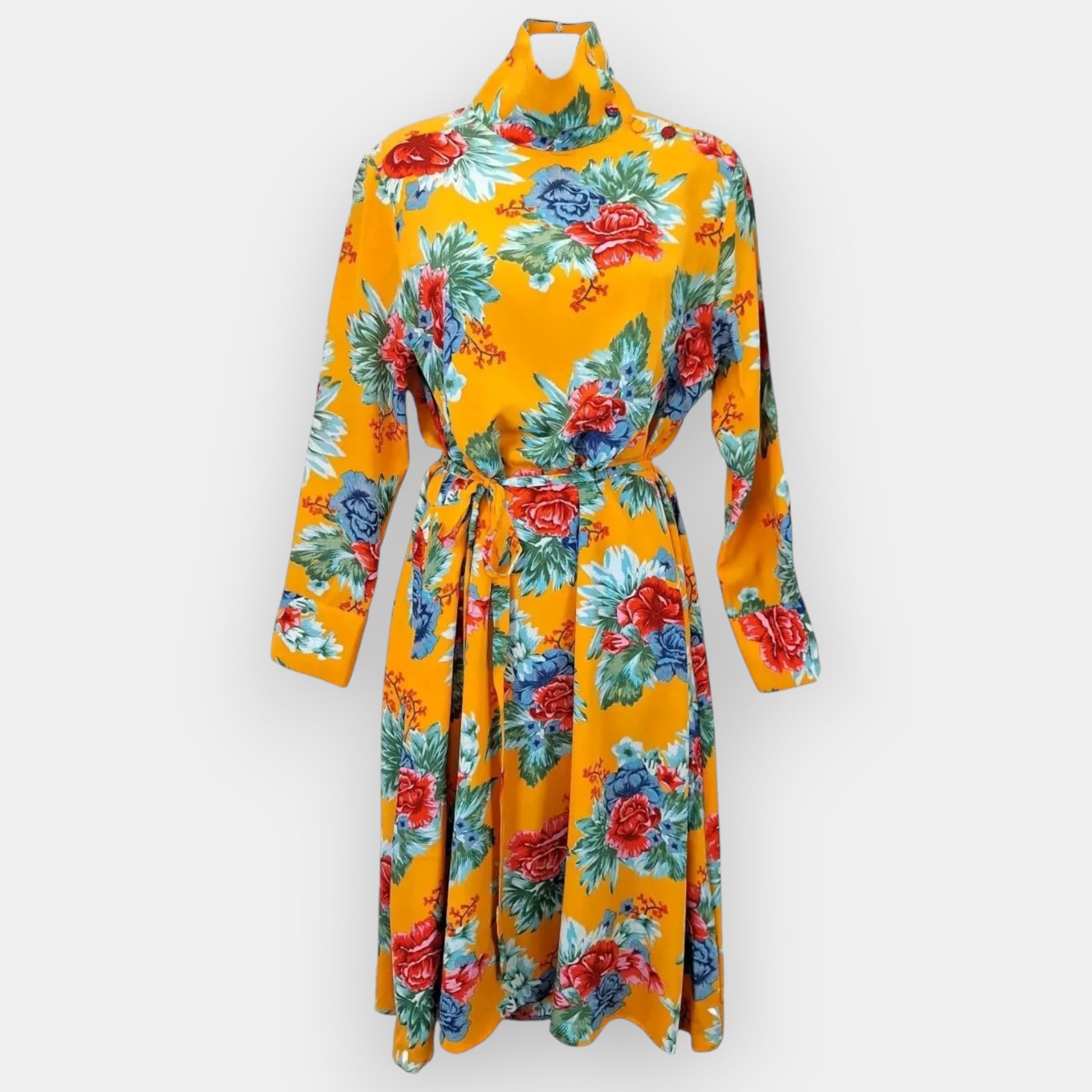 Details: Brightly coloured silk dress with side button high neck and self tie belt. Neck buttons can be worn open or closed.