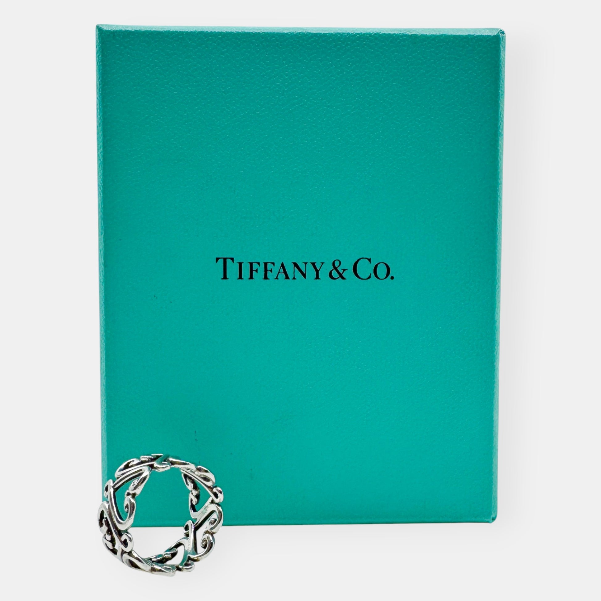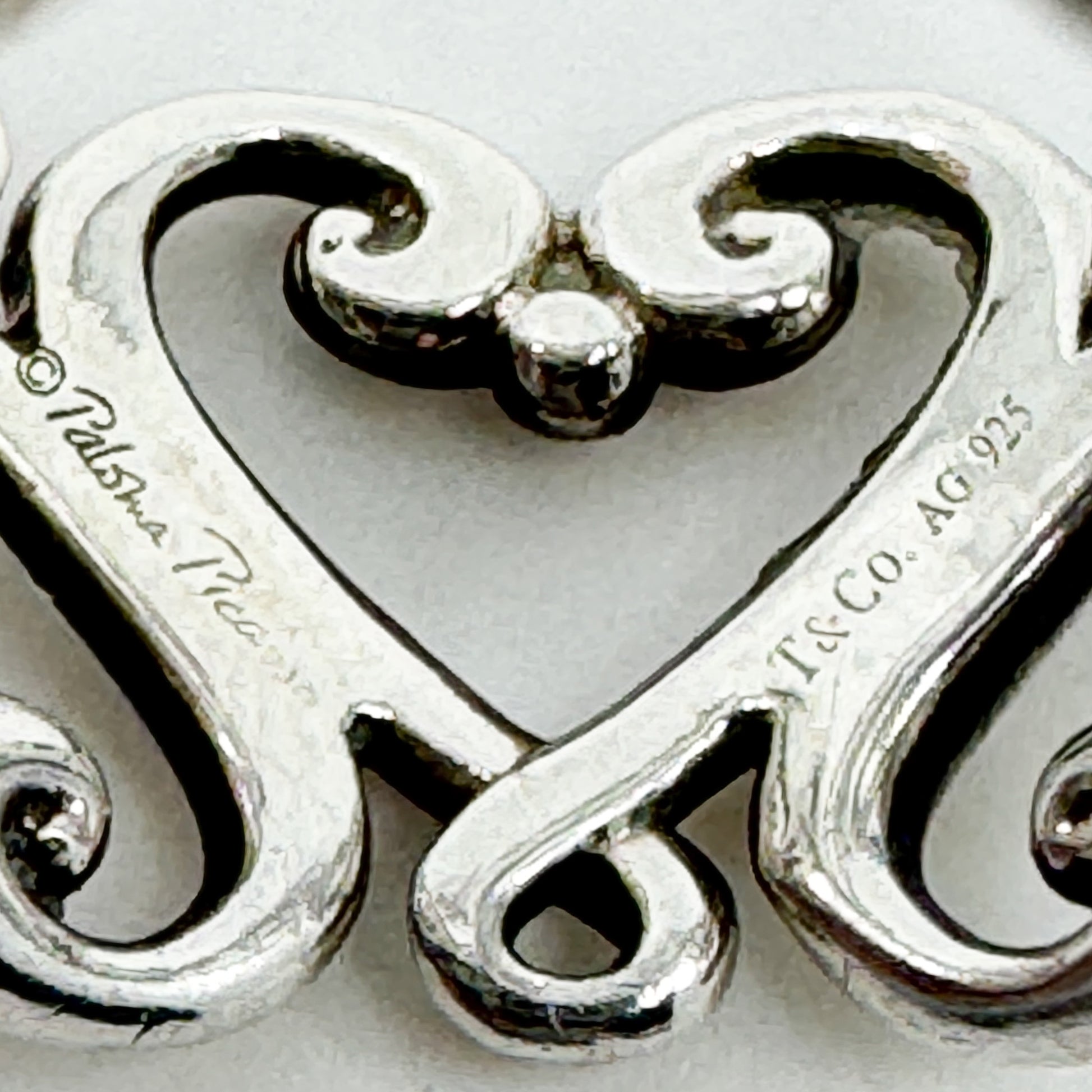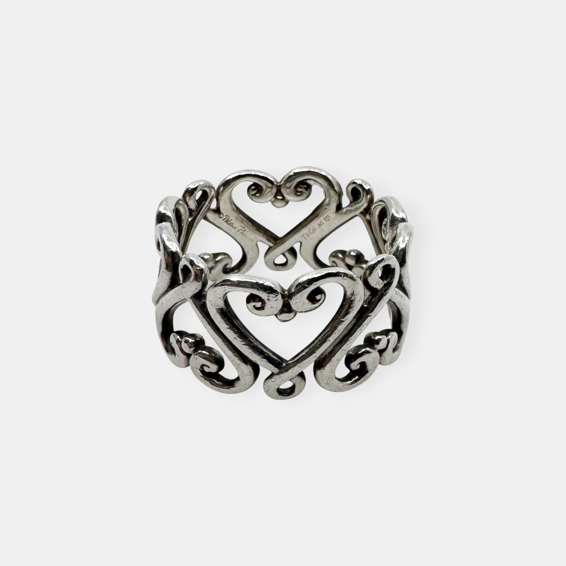 Details: A beautifully intricate heart motif ring designed by Paloma Picasso for Tiffany & Co. as part of the Venezia Goldoni collection. Inspired by Venetian ironwork, this romantic piece is crafted in solid sterling silver (925) and features sculptural openwork in a repeating heart pattern. Signed Paloma Picasso and stamped T&Co. AG 925.