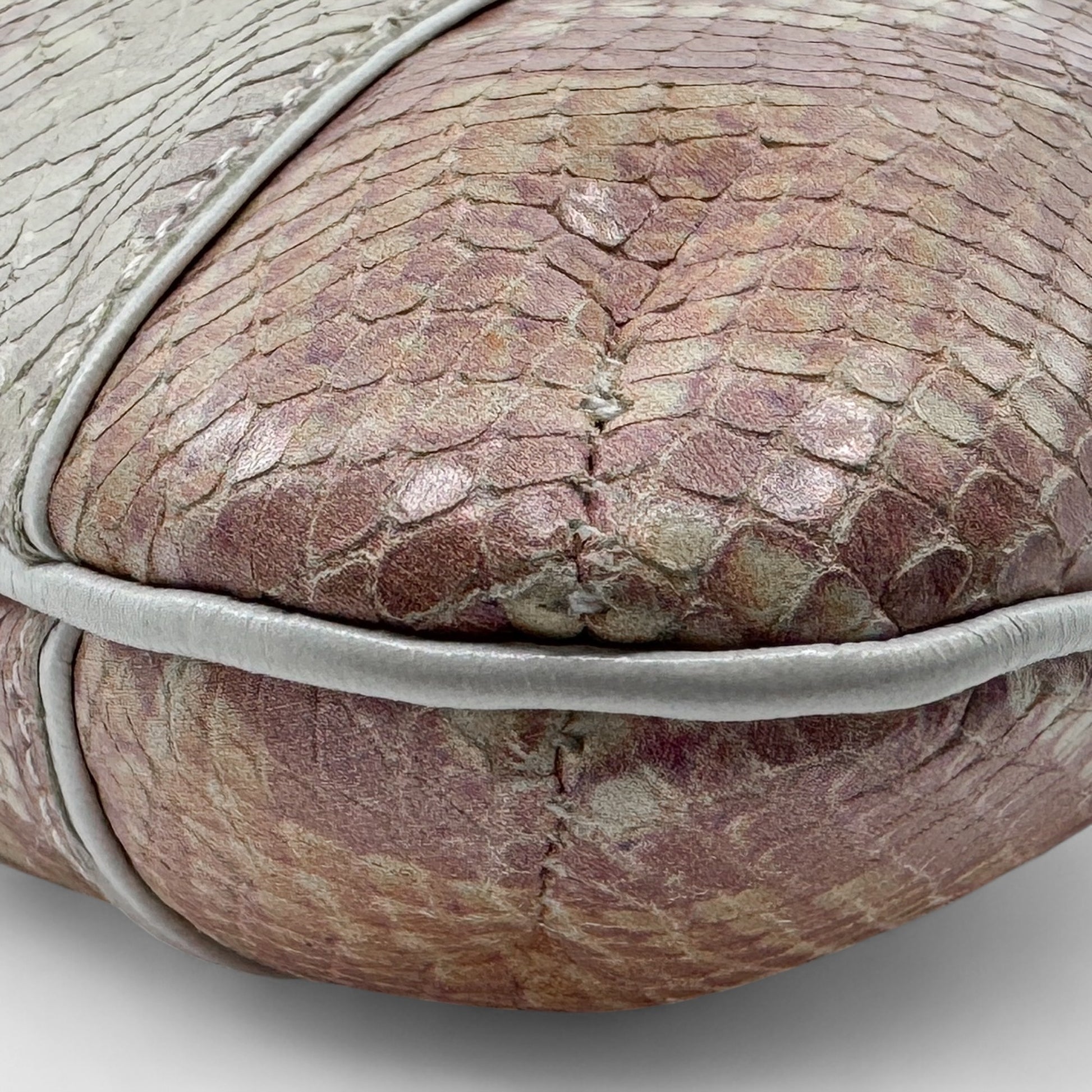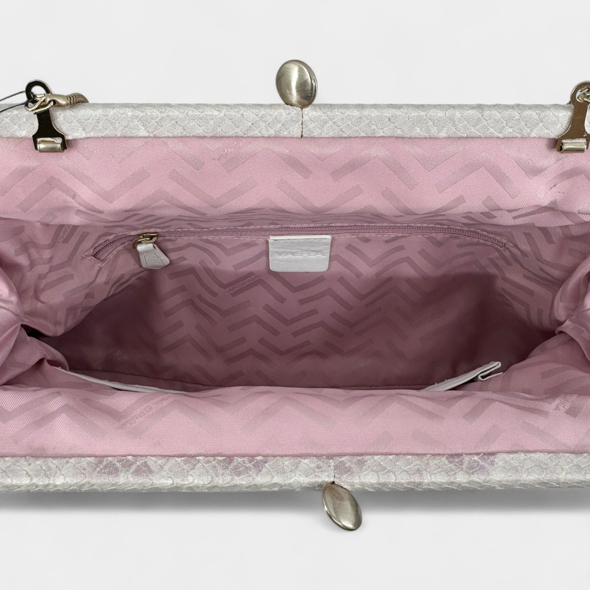 Details: In shades of soft pink and off white, this classic snake embossed leather clutch can be worn two ways. Worn folded as a clutch or over the shoulder with the included chain. Comes with dust bag. Made in Italy.