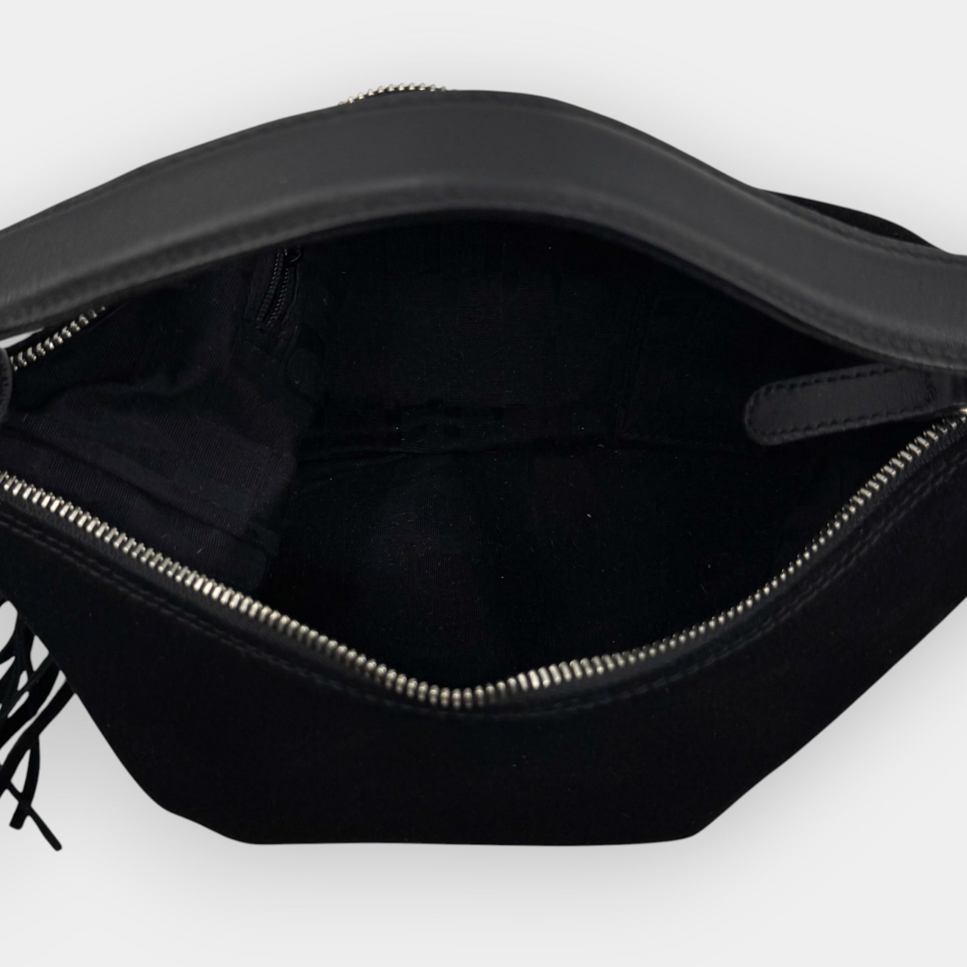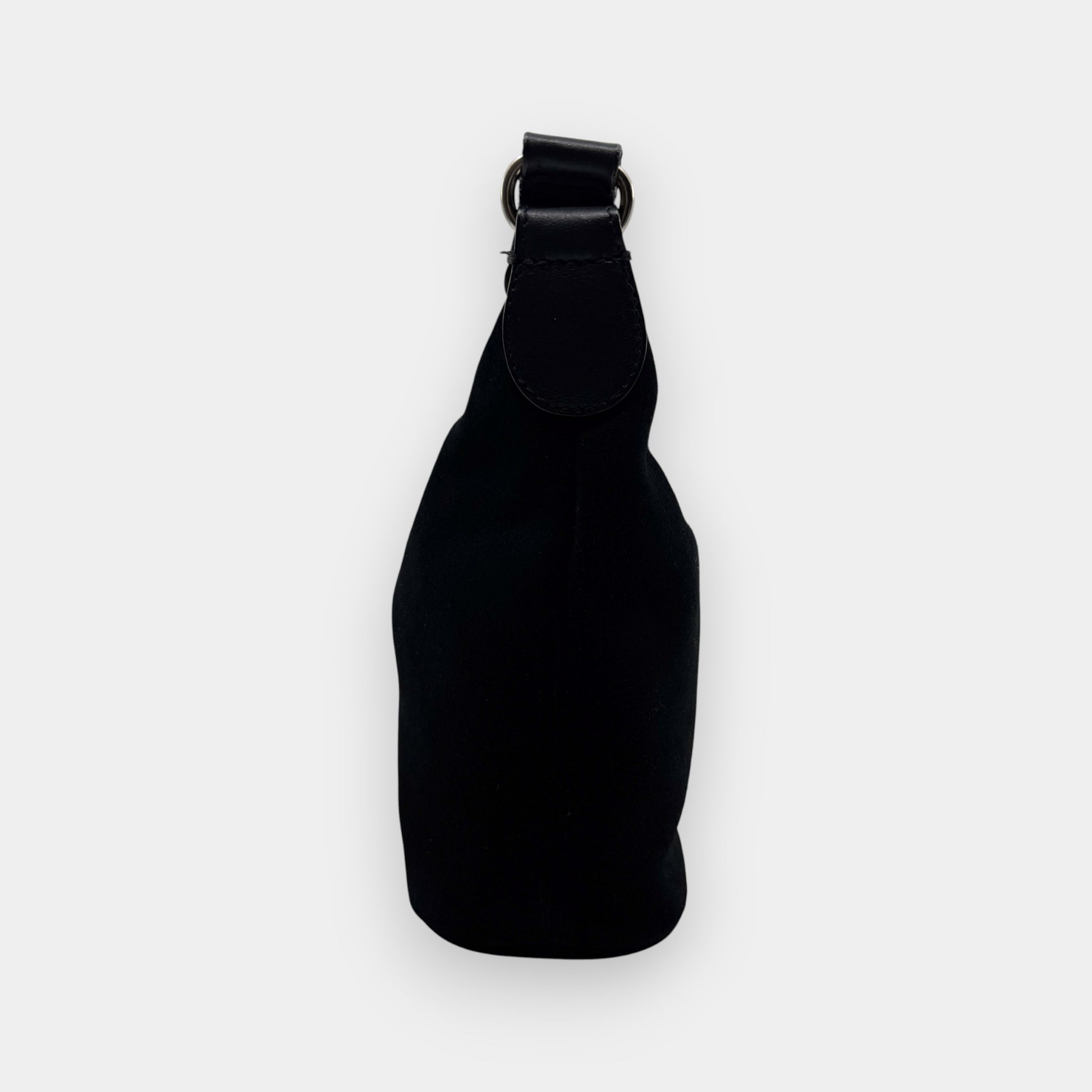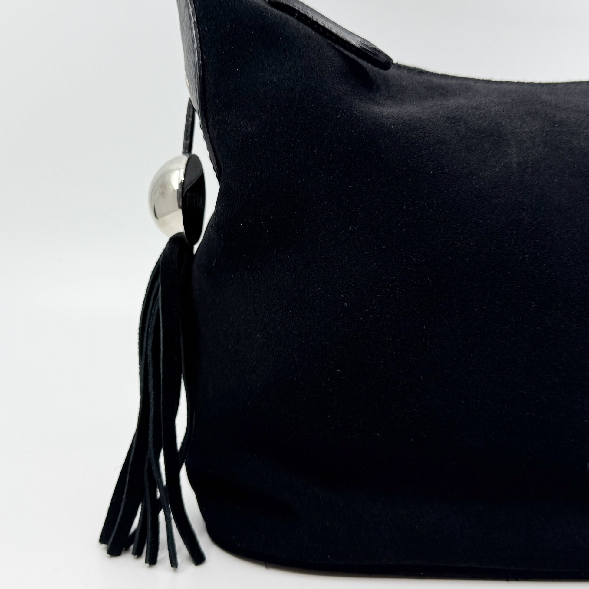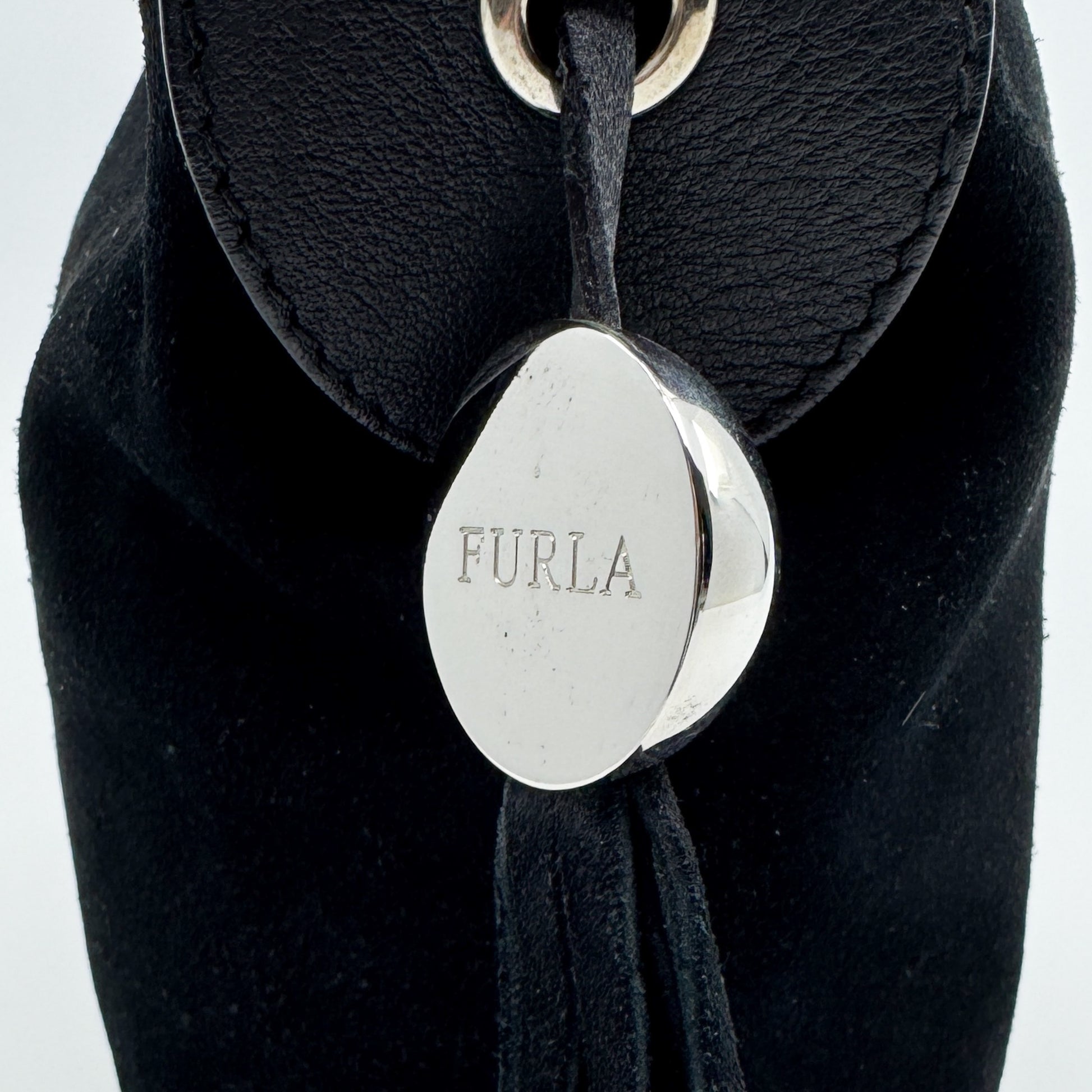 Details: Furla soft shoulder bag in very soft black suede with leather trim. Features top zip closure, single handle, and internal zip pocket. Comes with dust bag.