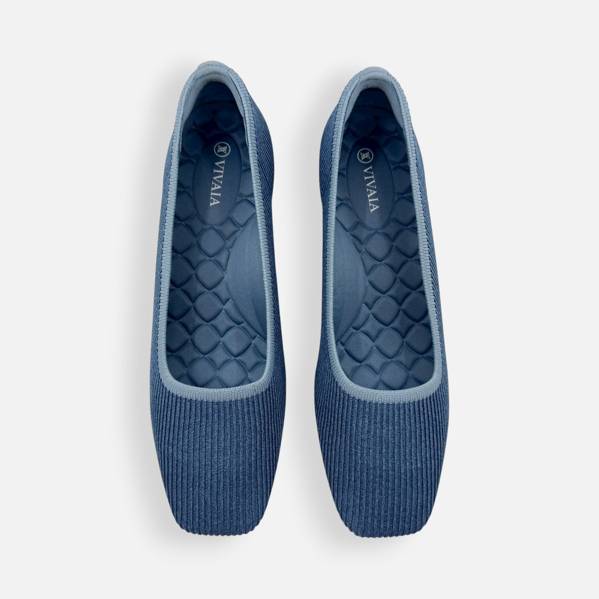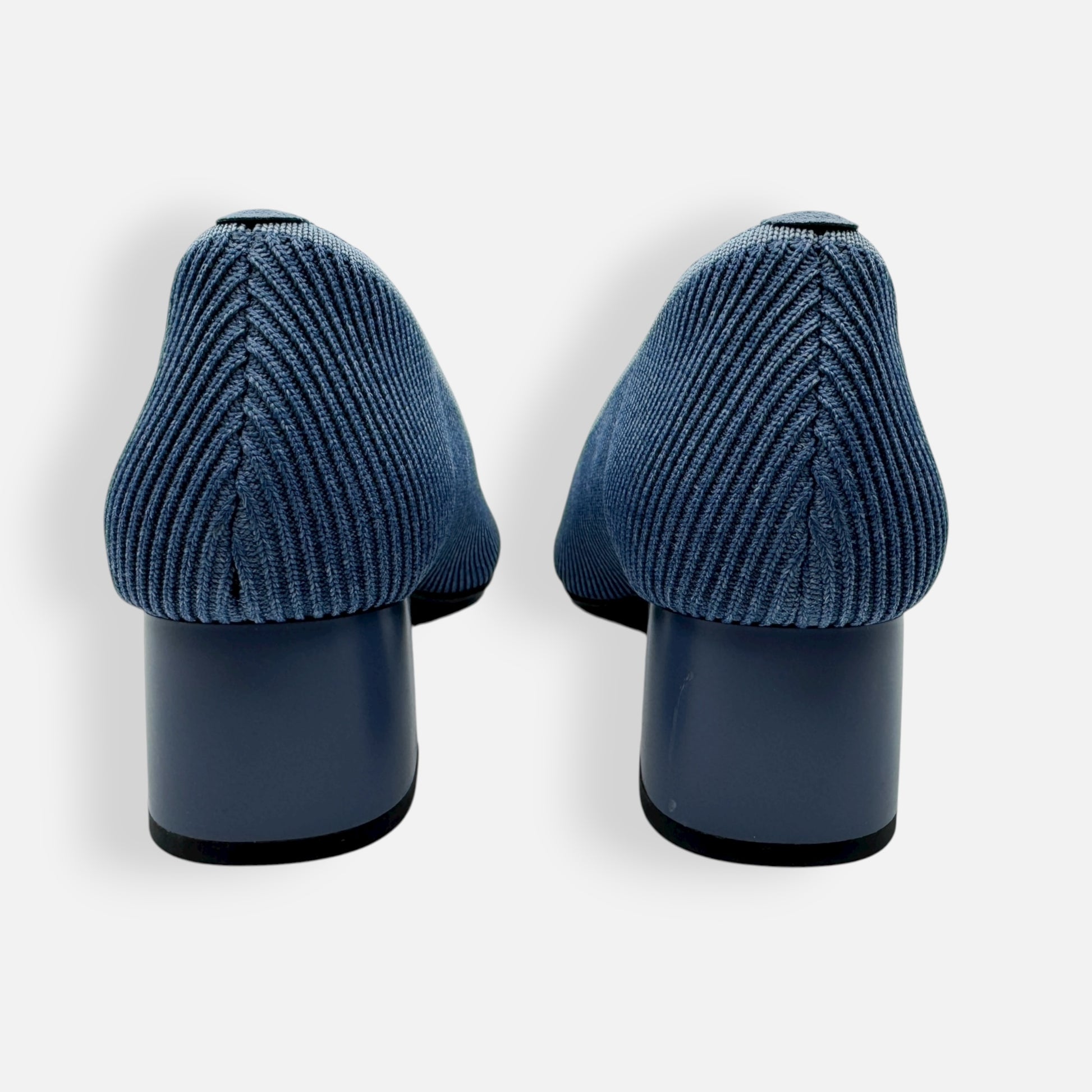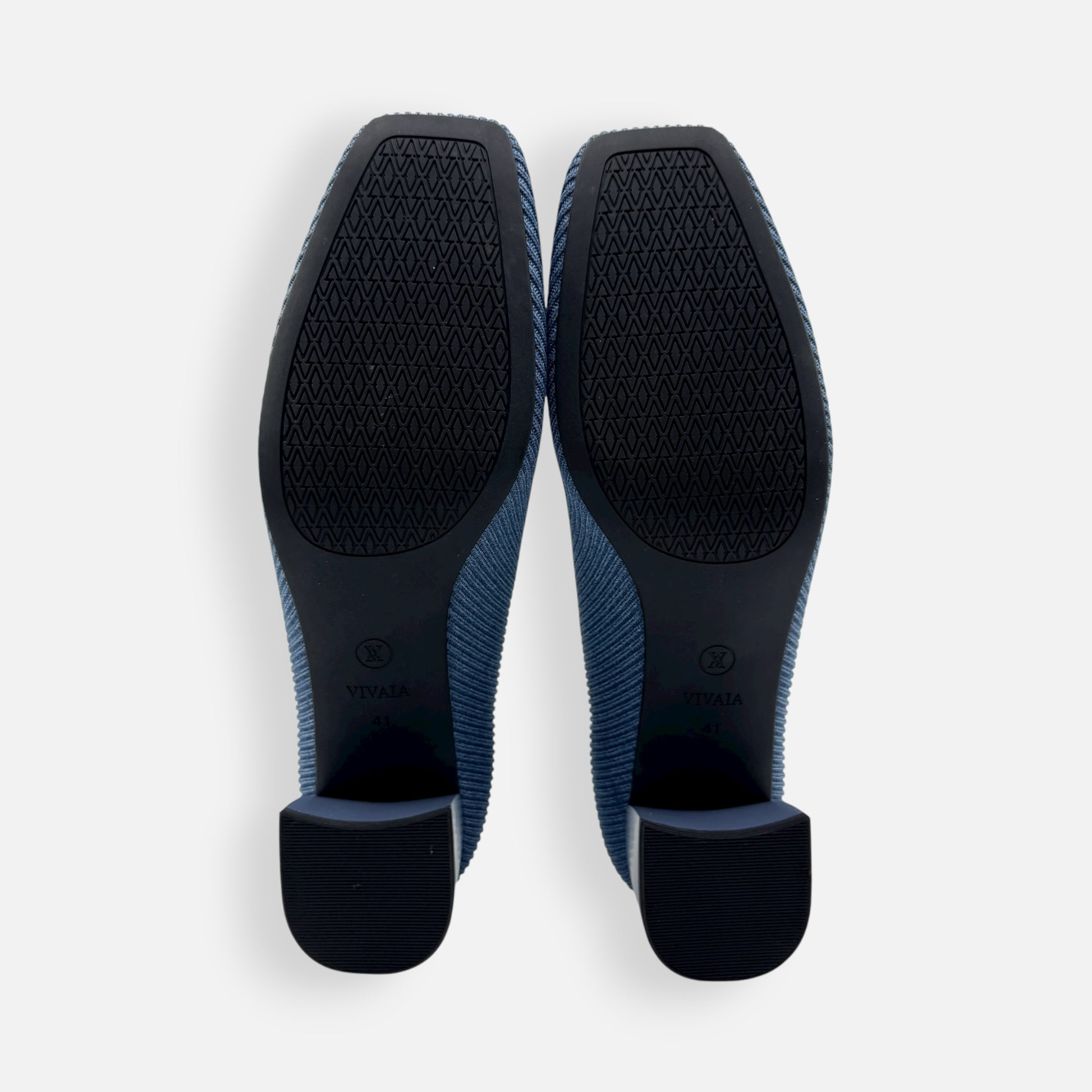 Details: Vivaia Melody mid-heel court shoes in light blue knit. Features a square toe, block heel, padded back, and eco-friendly breathable uppers made from recycled plastic bottles. Designed with deodorising insoles and anti-slip rubber outsoles. Heel height 4.5 cm.