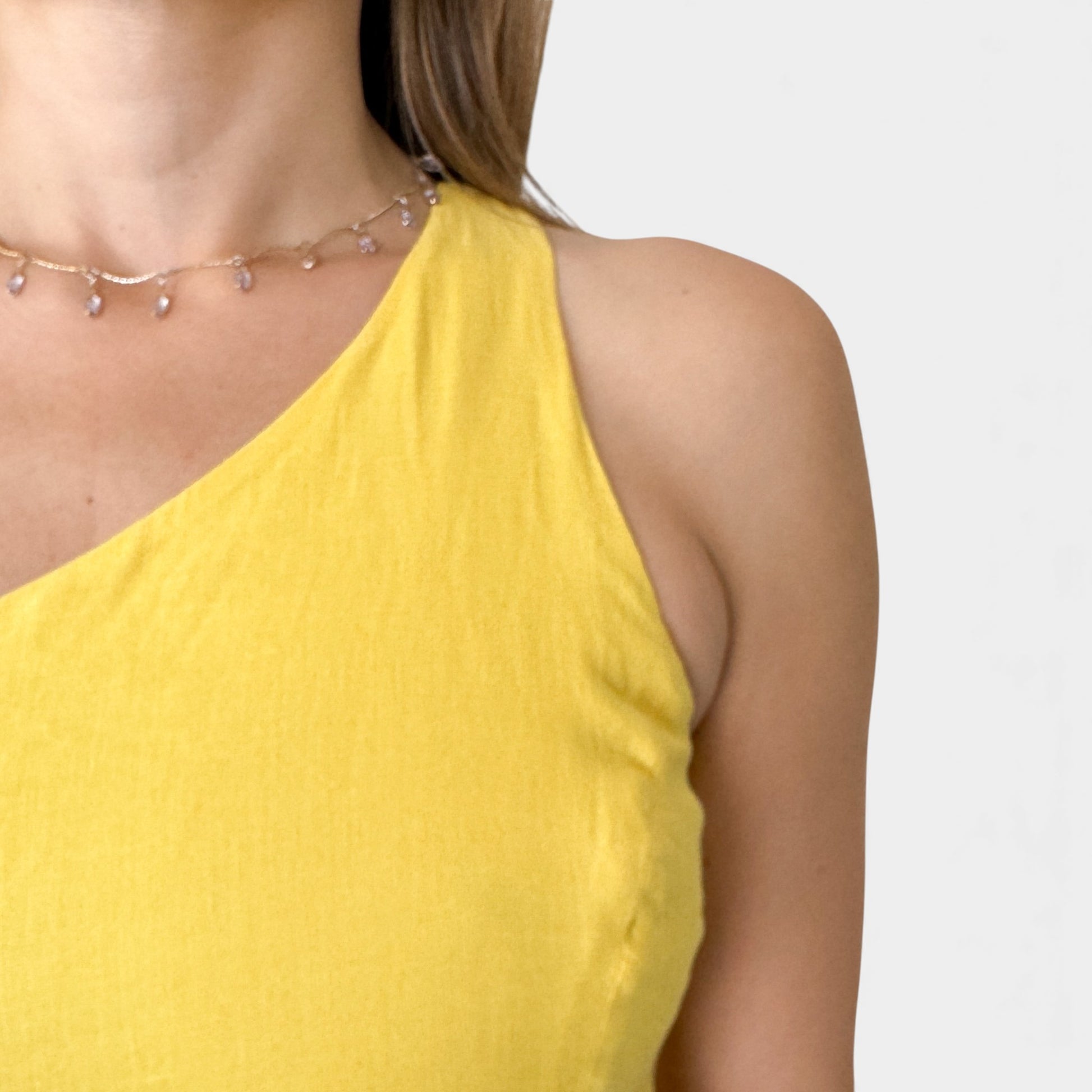 Details: Pretty in yellow ruffle dress made from linen. Shoulder tie and tiered ruffle hem. A go-to summer casual and party dress.