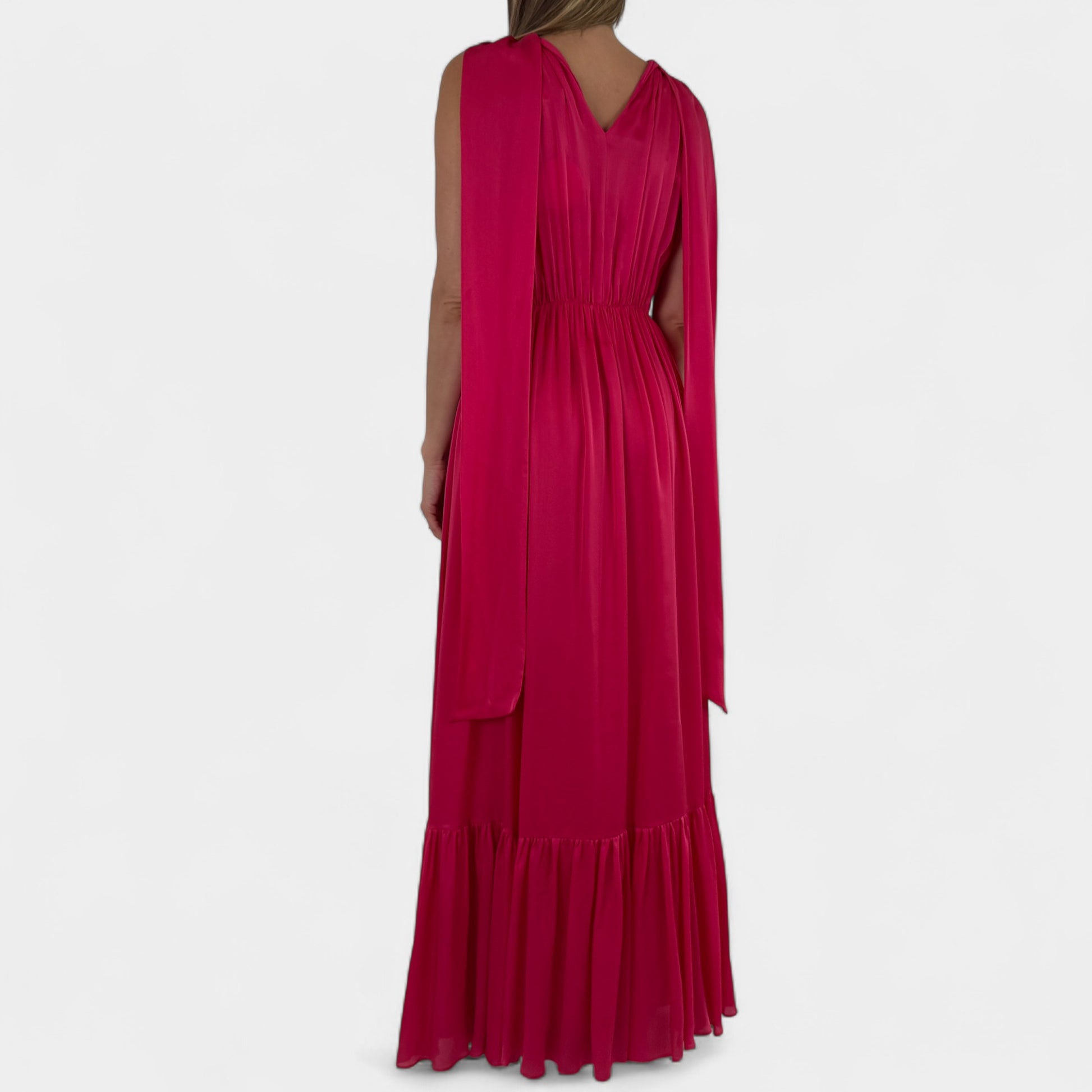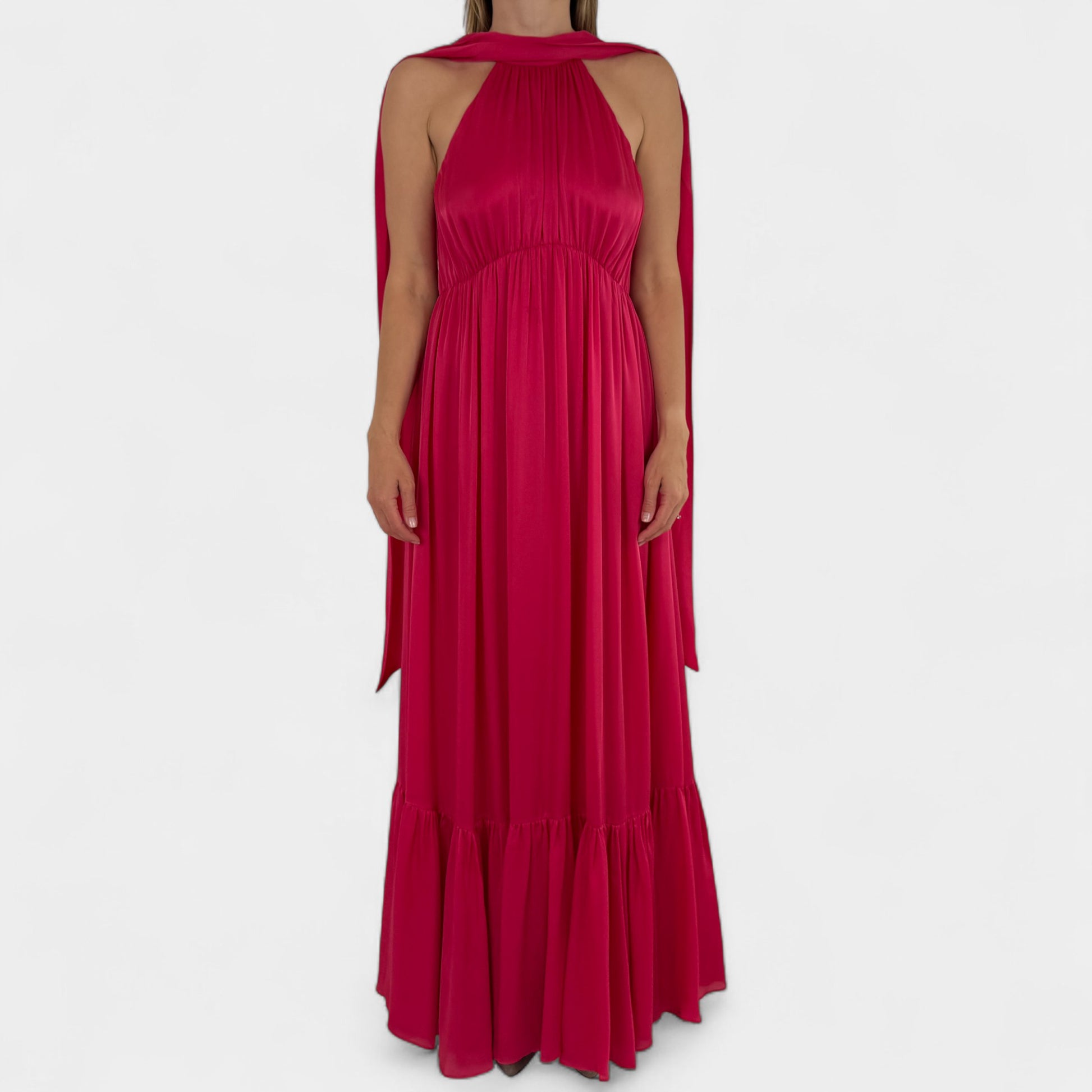 Details: This Zimmermann maxi dress in vibrant fuchsia pink silk satin features a gathered silhouette and a sophisticated tie-neck design. Crafted from luxurious silk, it offers a sleeveless cut, a flowing flared shape, and a delicately ruffled hem, creating an elegant and graceful long-length statement piece.