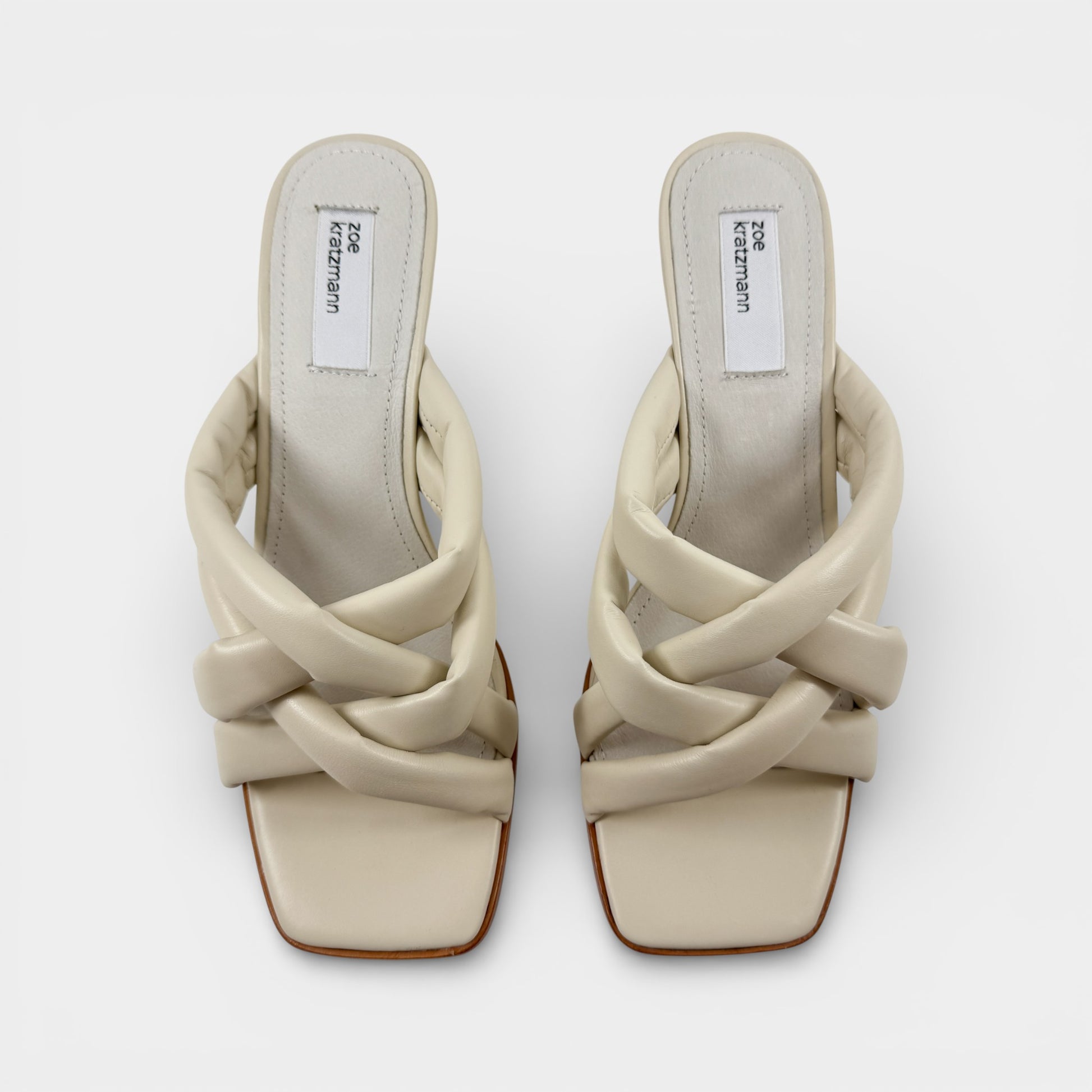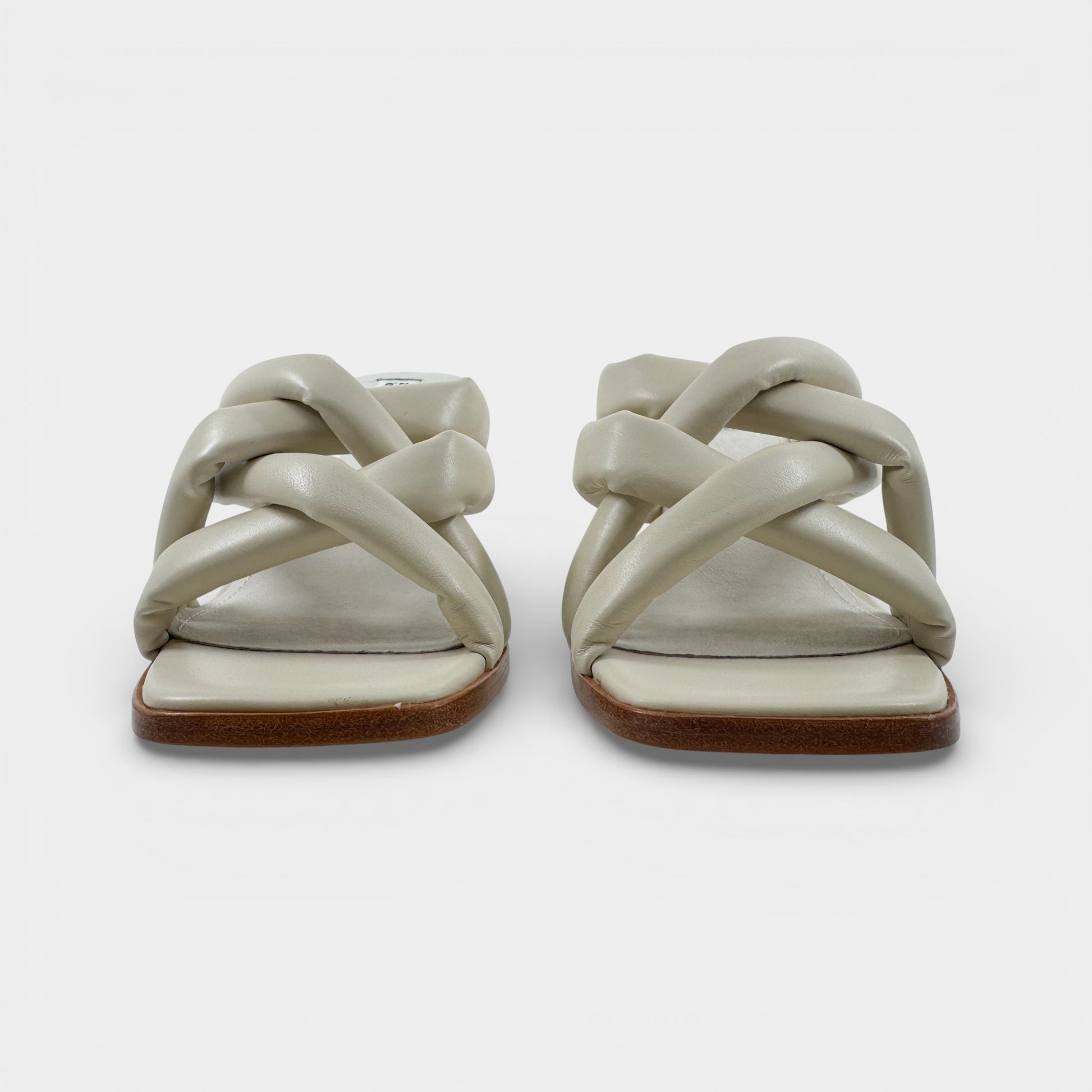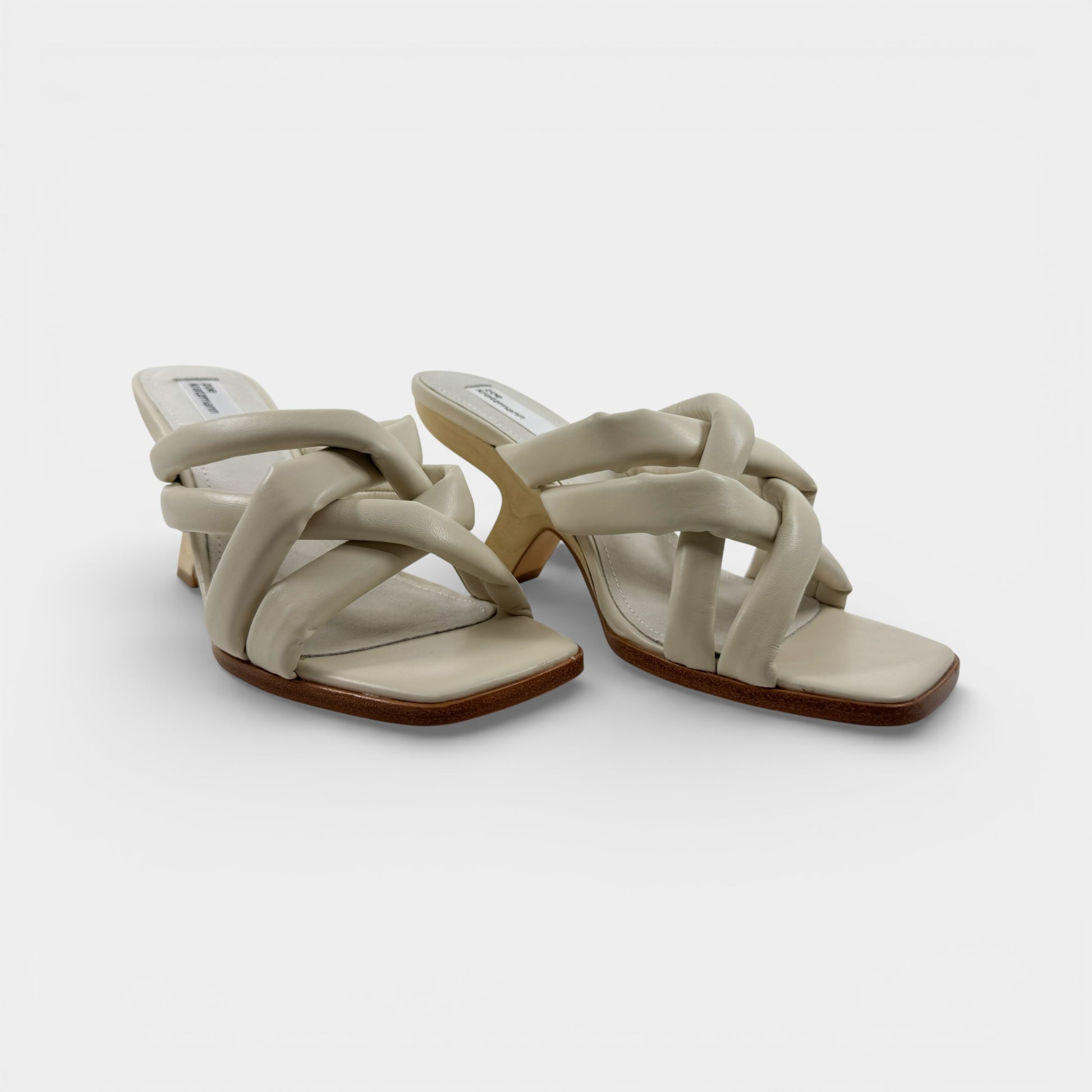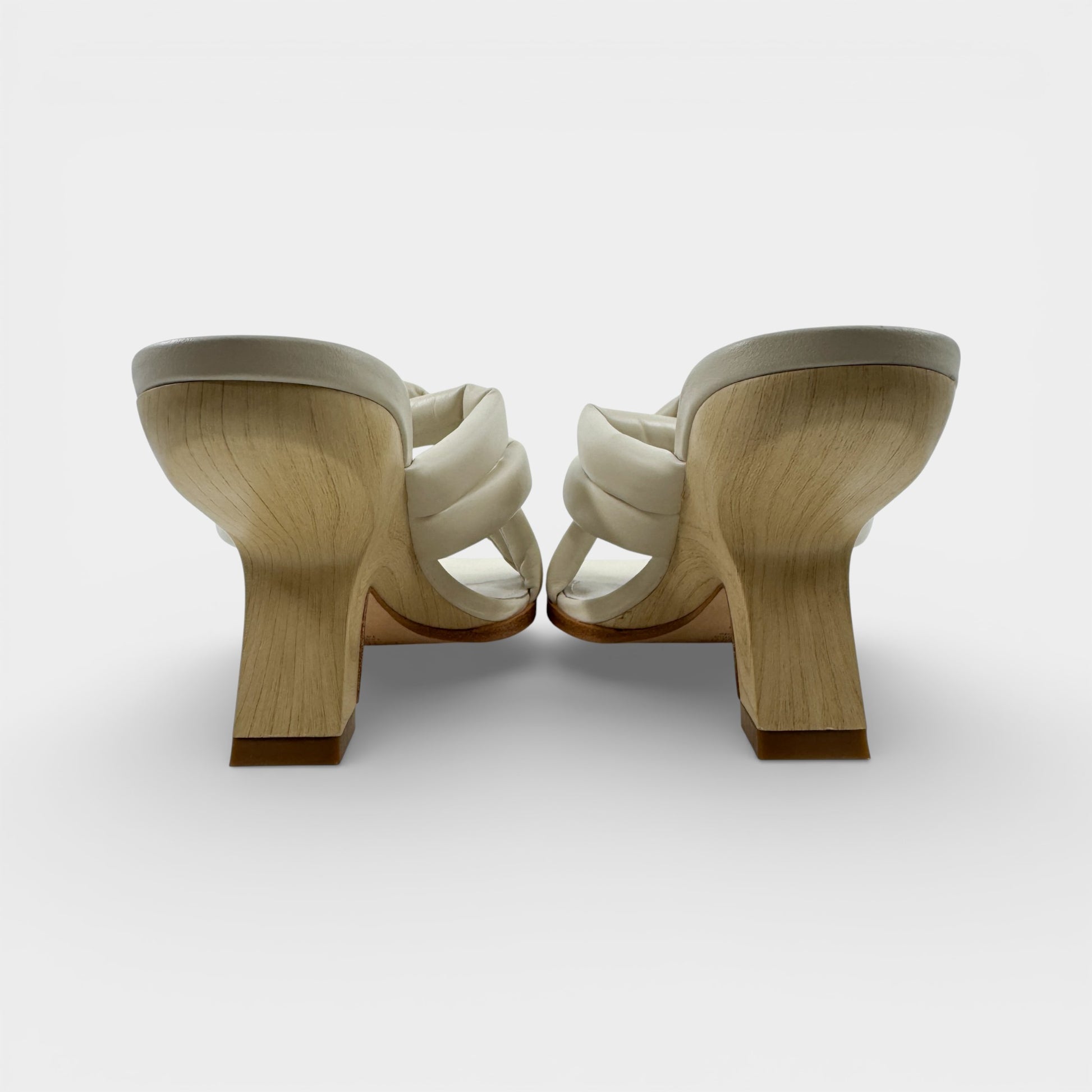 Details & Composition: Soft puffy leather braided leather mules on an inverted wooden heel. Fabulous neutral bone leather. Leather upper and sole. Finished with a squared-off toe shape - make this style your go-to! Fab with jeans and dresses too!